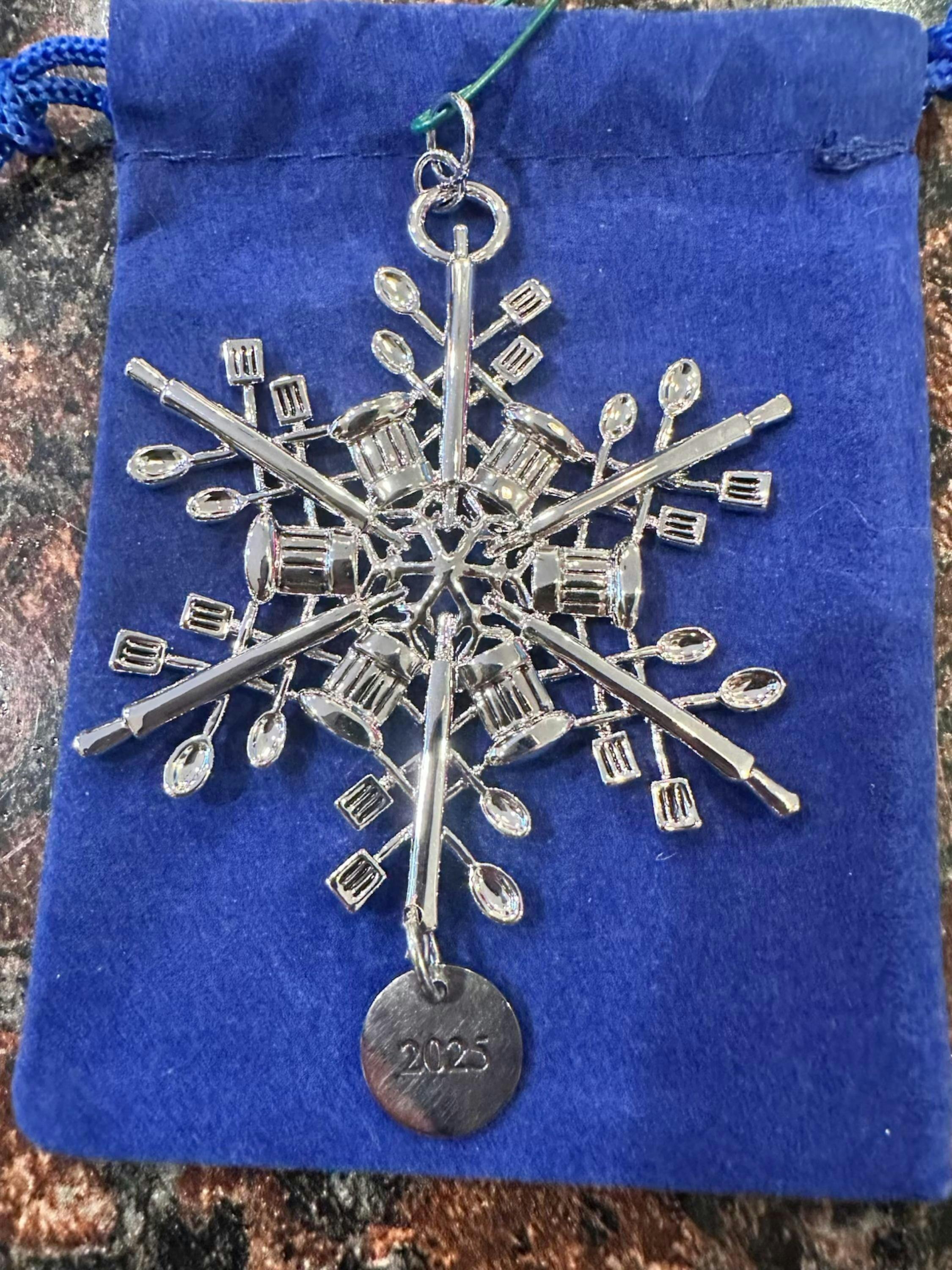 Look for six rolling pins, six chef hats, twelve spoons, twelve spatulas, and a center snowflake, making up this unique snowflake.