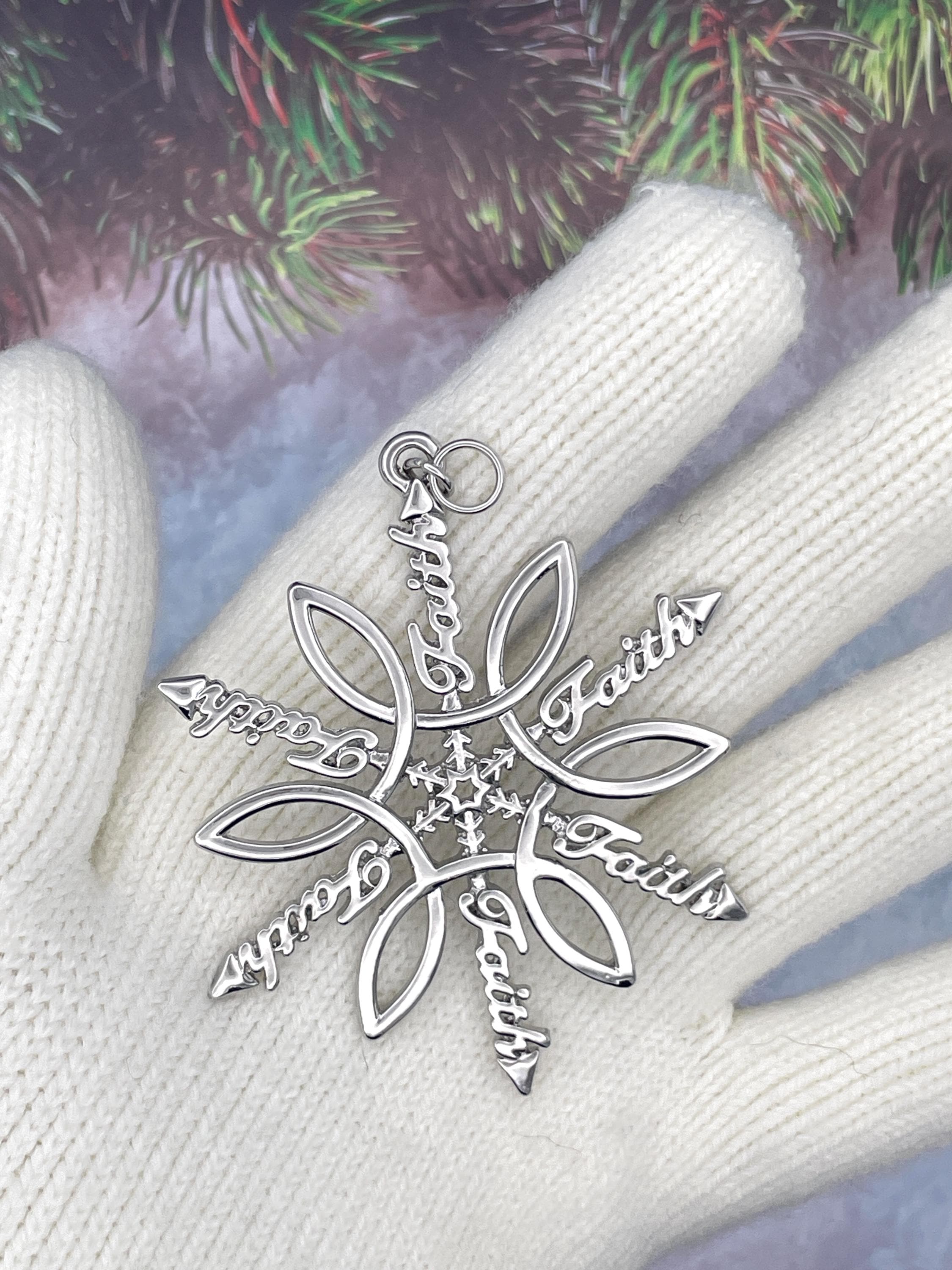 **Designed with Faith and Hope.** Look inside our snowflake ornament to find the Ichthys fish symbol surrounded by the word "Faith" on arrows. This beautiful SnowWonders snowflake ornament represents faith and believing in things not seen. The fish symbolizes Jesus, and the way they are positioned creates an unbreakable, connective knotwork. The arrows signify protection and spirituality, reminding us of our promises and making this a very special ornament. In the center is a star inside a smaller snowflake. Get one for a friend to remind her to hold steadfast, and consider getting one for yourself, too!