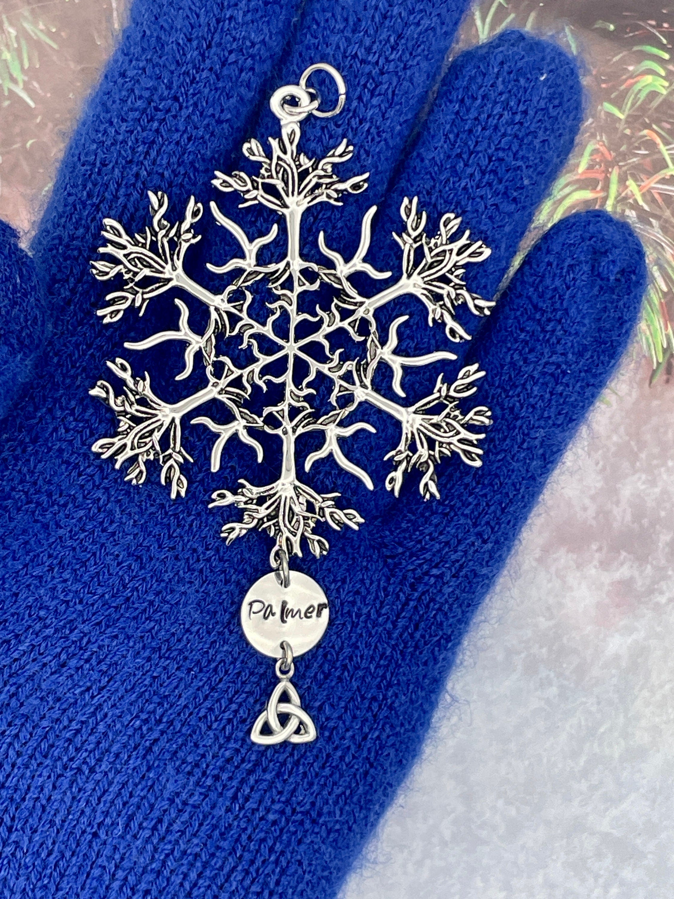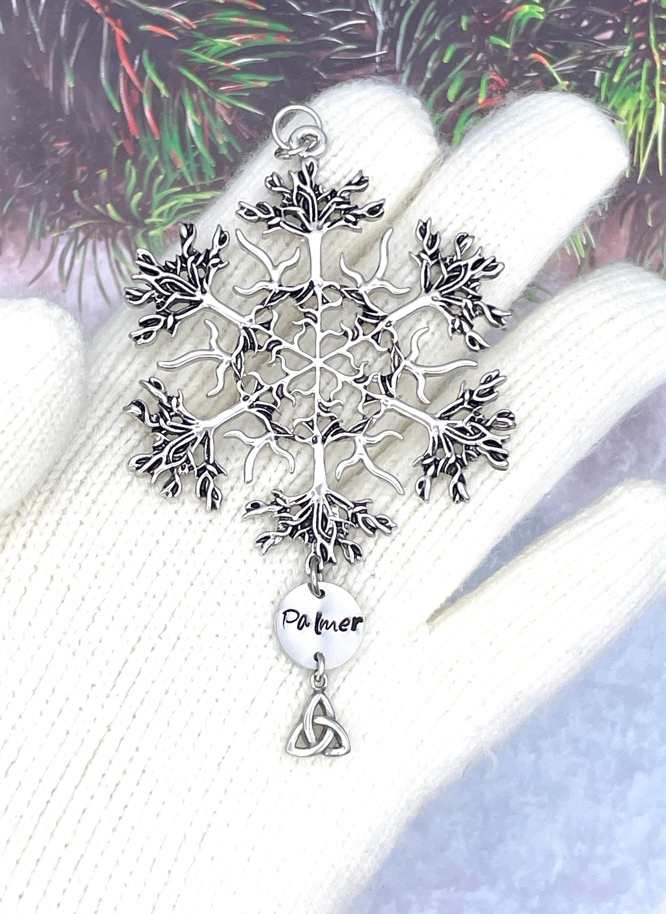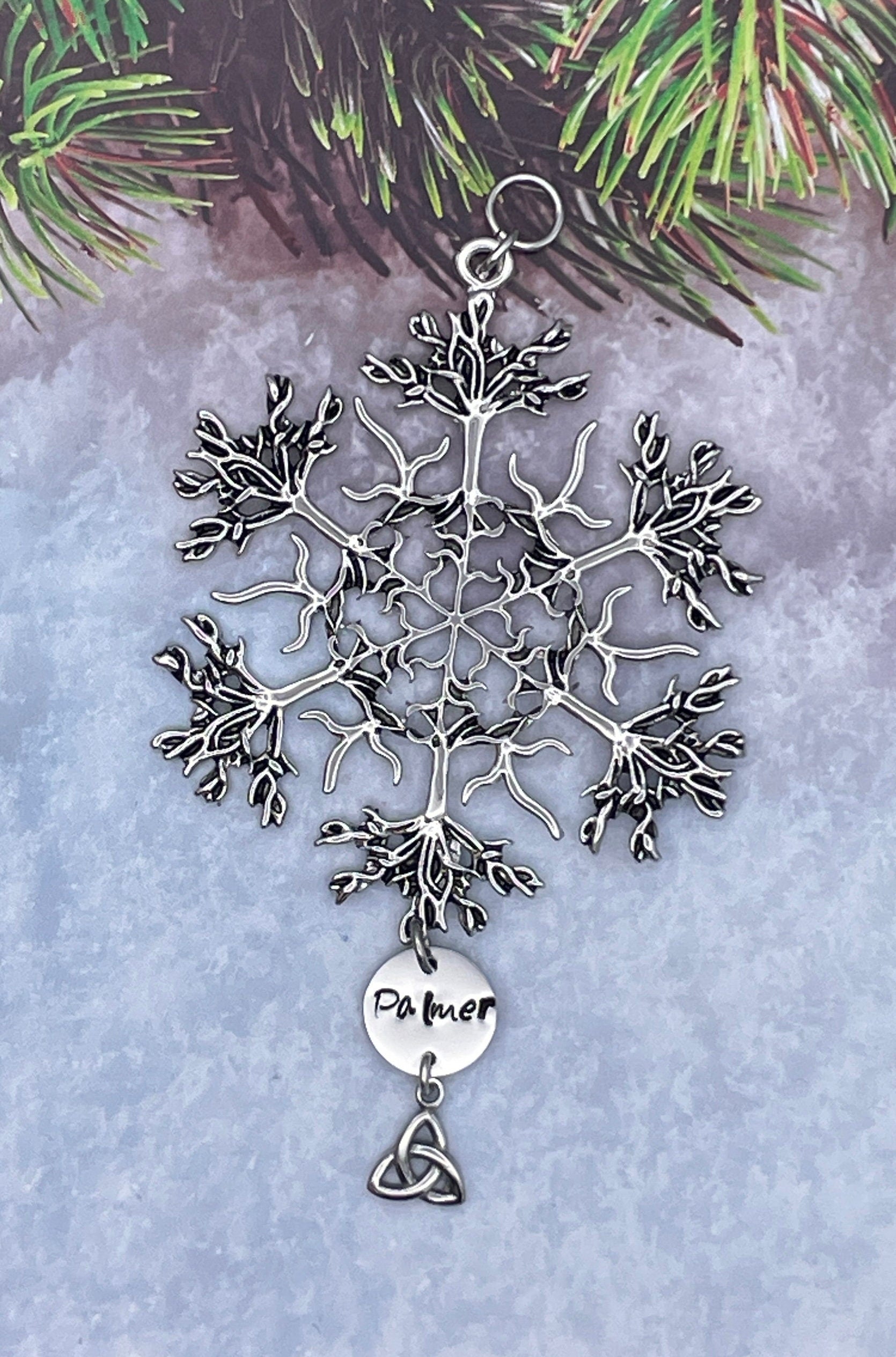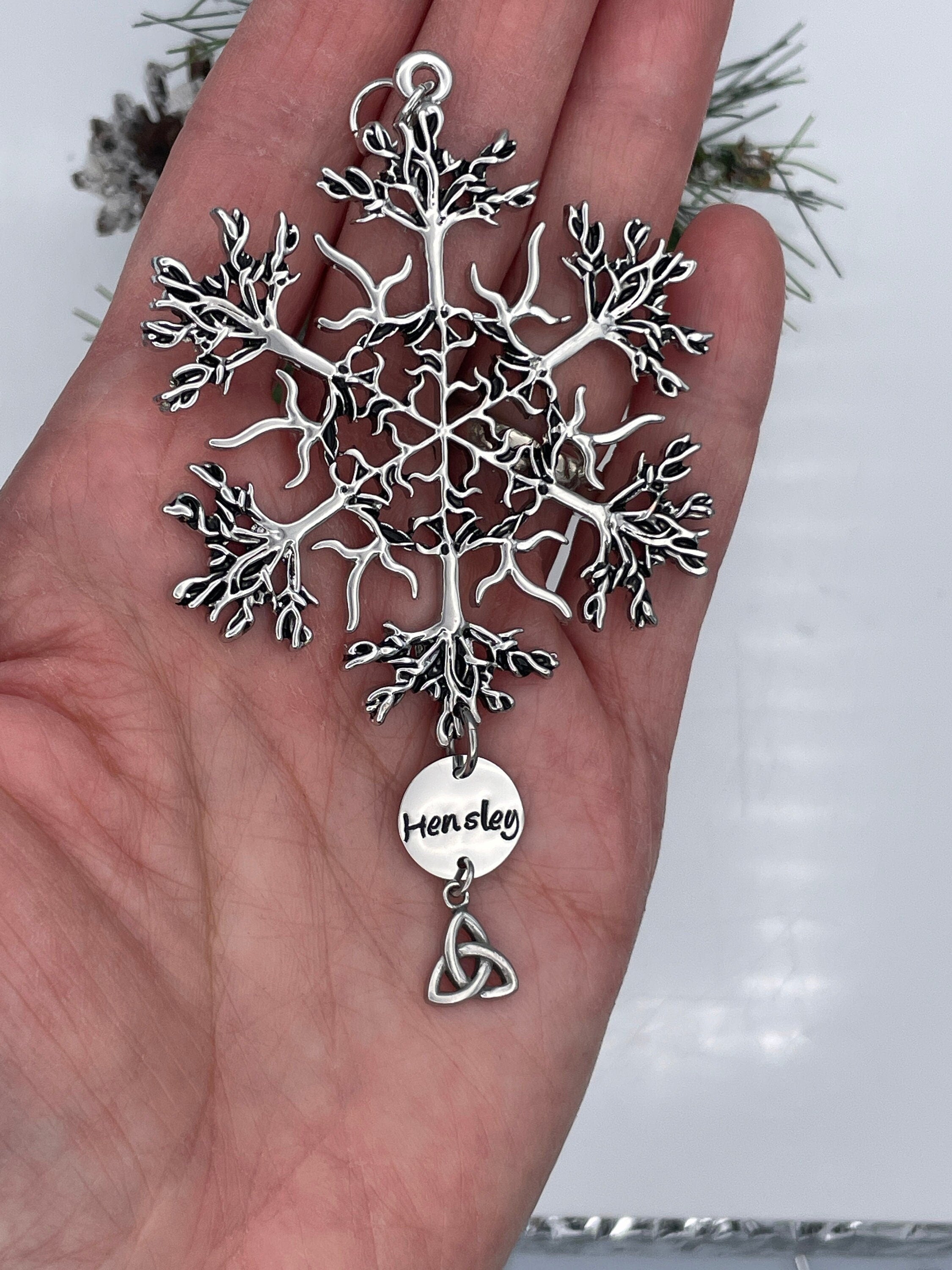 "Our Family Tree," is so striking and beautiful. It represents families and the strong roots that connect us all together. The intertwining of the branches and roots is just LIFE. It is such a reminder of how we need each other and are connected forever. It is about Tradition and honoring how our families are put together. It is inspired by our flowering Crab Apple Tree that sits at the end of our driveway. It was in the winter of 2018 when it caught my eye as it was glistening in the sun. We decided that we would make our tree into a beautiful snowflake ornament. We will add a trinity and your family name to this beautiful ornament!