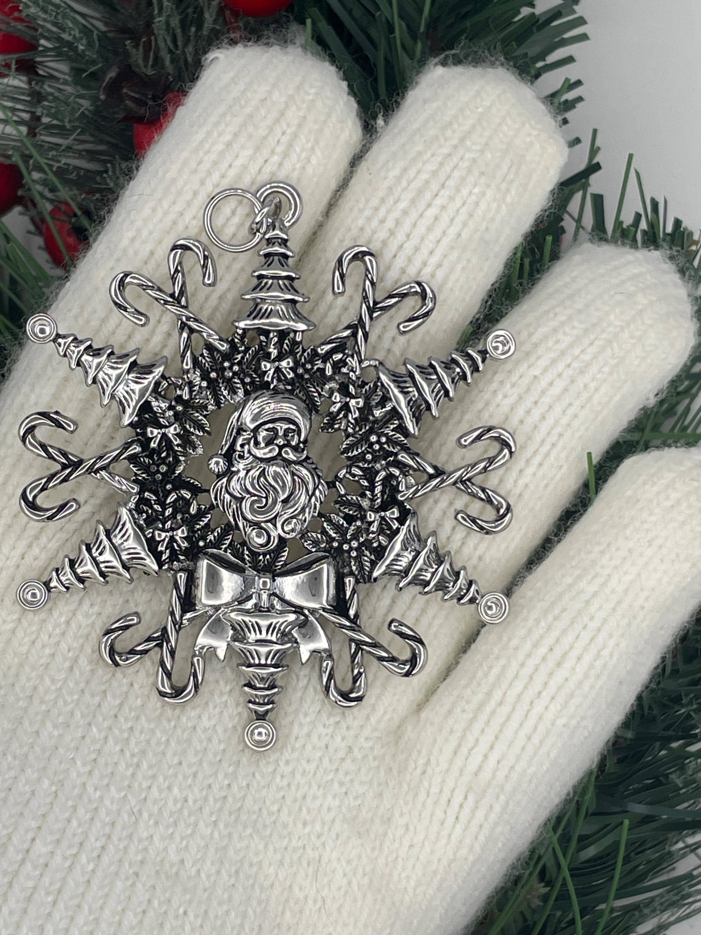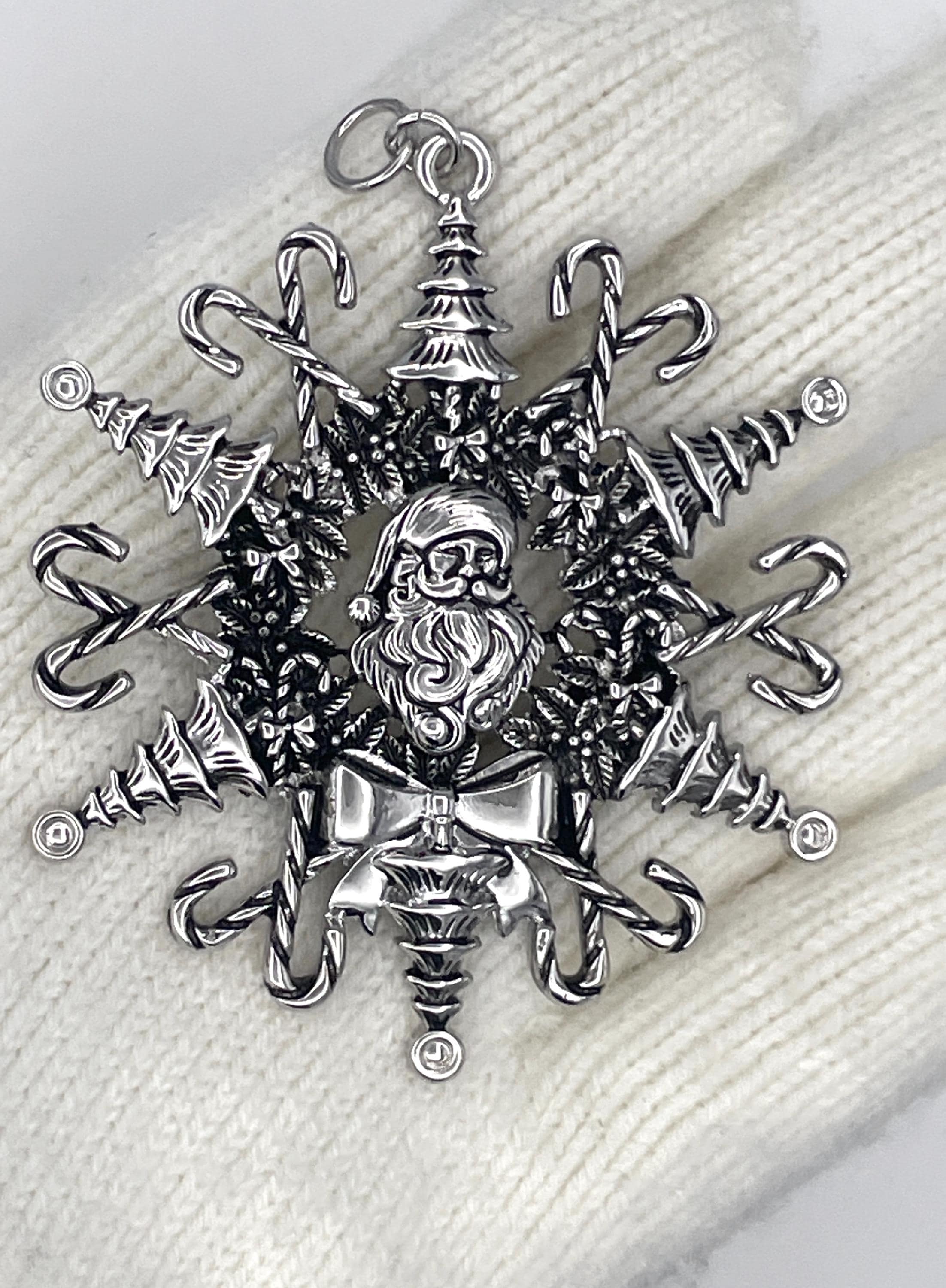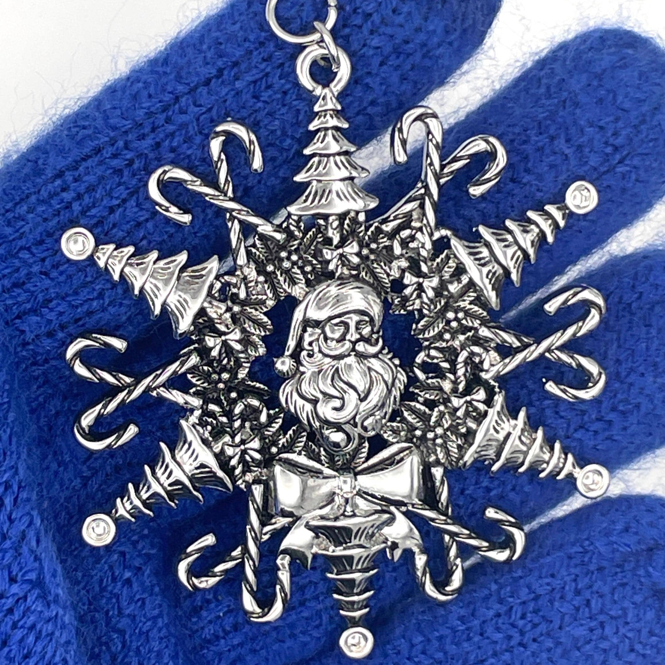 Our Santa Claus Snowwonder Snowflake ornament is the perfect festive decoration! Featuring a charming dimensional Santa at its center, this ornament is surrounded by six delightful Christmas trees and twelve candy canes, beautifully capturing the spirit of the season. A lovely Christmas wreath frames our stunning snowflake design, and just below Santa, you'll find a beautiful bow that completes this enchanting ornament. The details are amazing, making this Santa Snowwonder the ideal addition to any Christmas tree!